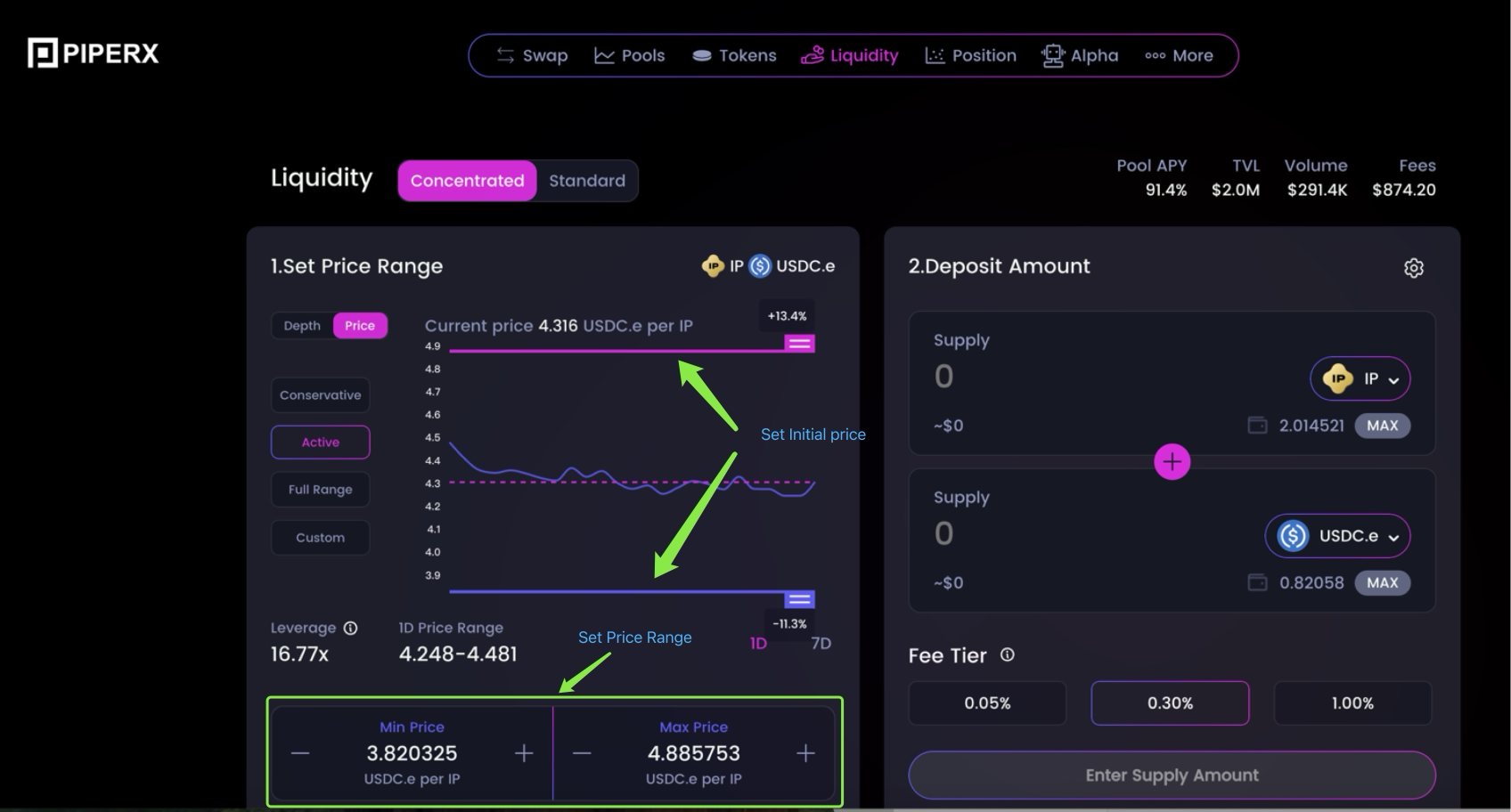 4. Set an **initial price** for the pool. Please specify a reasonable starting price, otherwise you may need to bear excessive impermanent loss. Besides, you need to set **a price range** which you want to allocate your initial liquidity into. The initial price must be within the range you selected.